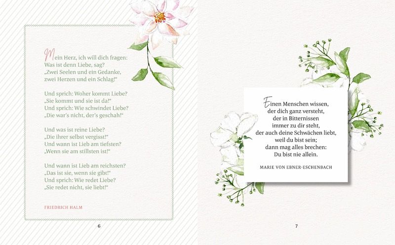 Ein wundervolles Geschenk für alle, denen wir zur Hochzeit das Beste wünschen. Eine Auswahl der schönsten Gedichte und Gedanken über das Glück zu zweit lädt dazu ein, den schönsten Tag im Leben und die Liebe in all ihren Facetten zu feiern. Berührend und inspirierend begleitet dieses liebevoll gestaltete Buch das Brautpaar auf seiner Reise in die gemeinsame Zukunft.