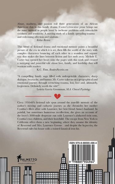 Circa 1950-60's ¿ctional tale spun around the true-life memoir of the author's moving and cathartic journey as she chronicles her mother Cynthia's illicit äair with Laurence, her best friend Anna's husband. In painful, but sometimes humorous recollection, she gives an account of the lover's 3000-mile desperate run with Laurence's abducted twin sons, Cynthia's two children, and their lovechild. The escape from New York to California o¿ers them a new beginning, where they assume the identity of Reverend and Mrs. Laurence Greene-and despite the hypocrisy, the Reverend rules his house with a twisted fanatical iron ¿st.