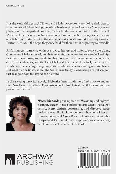 It is the early thirties and Clinton and Mader Morehouse are doing their best to raise their six children during one of the harshest times in America. Clinton, once a playboy and accomplished musician, has left his dreams behind to farm the dry land. Mader, a skilled seamstress, has always relied on her endless energy to help create a path for their future. But as the dust constantly swirls around their tiny town of Burton, Nebraska, the hope they once held for their lives is beginning to dwindle. As farmers try to survive without crops to harvest and water to revive the plants, Clinton and Mader must rely on their creativity and education to ease the hardships that are causing many to perish. As they do their best to overcome malnutrition, death, black blizzards, and the loss of beloved trees needed for fuel, the perpetual winds rage on, seemingly laughing at those who are able to stand against its bluster. But what no one knows is that the Morehouse family is embracing a secret weapon that may just hold the key to their survival. In this riveting historical novel, a Nebraska farm couple must find a way to endure the Dust Bowl and Great Depression and raise their six children to become productive citizens.