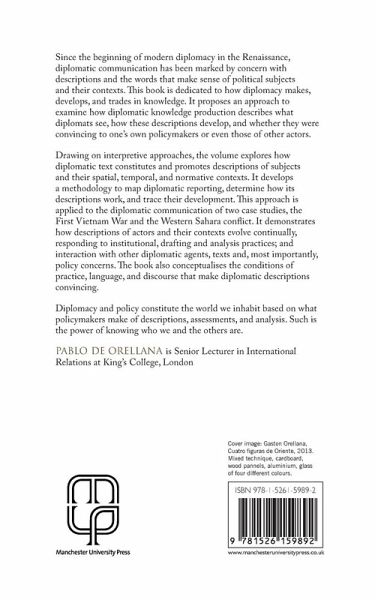 Since the beginning of modern diplomacy in the Renaissance, diplomatic communication has been marked by concern with linguistic precision and the words that make sense of political subjects and their contexts. This book is dedicated to how diplomacy makes, develops and trades in knowledge. It proposes an approach to examine how diplomatic knowledge production describes what diplomats see, how these descriptions develop, and whether they were convincing to one's own policymakers or even those of other actors. Drawing on interpretive approaches, the volume explores how diplomatic text constitutes and promotes descriptions of subjects and their spatial, temporal and normative contexts. It develops a methodology to map diplomatic reporting, determine how its descriptions work, and trace its development. This approach is applied to the diplomatic communication of two case studies, the First Vietnam War and the Western Sahara conflict, demonstrating how descriptions of actors and their contexts evolve continually, responding to institutional, drafting and analysis practices and interaction with other diplomatic agents, texts and, most importantly, policy concerns. The book also conceptualises the conditions of practice, language, and discourse that make diplomatic descriptions convincing. Diplomacy and policy constitute the world we inhabit based on what policymakers made of descriptions, assessments and analysis. Such is the power of knowing who we and the others are.