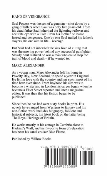 HAND OF VENGEANCE Saul Powers was the son of a gunman - shot down by a gang of killers when Saul was only five years old. From his dead father Saul inherited the lightning reflexes and accurate eye with a Colt. From his mother he learnt hatred and vengeance. One by one Saul trailed his father's slayers, his one aim in life - revenge. But Saul had not inherited the sick love of killing that was the moving power behind any successful gunfighter. Slowly Saul realized he was a man who could stop the trail of blood and death - if he wanted to.M
