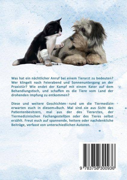 Was hat ein nächtlicher Anruf bei einem Tierarzt zu bedeuten? Wer klingelt nach Feierabend und Sonnenuntergang an der Praxistür? Wie endet der Kampf mit einem Kater auf dem Behandlungstisch, und schaffen es die Tiere vom Land der drohenden Impfung zu entkommen?Diese und weitere Geschichten rund um die Tiermedizin erwarten euch in diesem Buch. Mal sind sie aus Sicht des Patientenbesitzers, mal aus der des Tierarztes, der Tiermedizinischen Fachangestellten oder des Tieres selbst erzählt. Freut euch auf spannende, heitere oder nachdenkliche Beiträge, verfasst von unterschiedlichen Autoren.