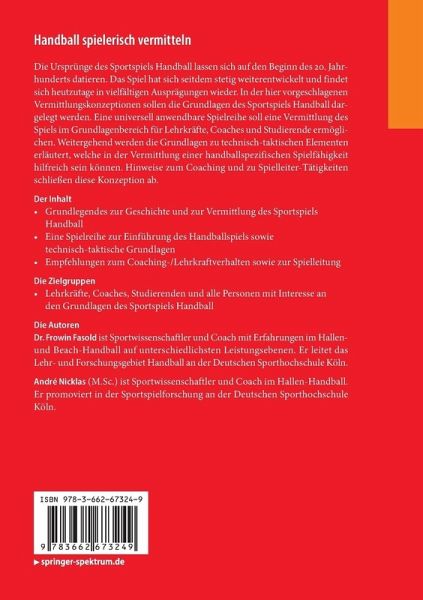 Die Ursprünge des Sportspiels Handball lassen sich auf den Beginn des 20. Jahrhunderts datieren. Das Spiel hat sich seitdem stetig weiterentwickelt und findet sich heutzutage in vielfältigen Ausprägungen wieder. In der hier vorgeschlagenen Vermittlungskonzeptionen sollen die Grundlagen des Sportspiels Handball dargelegt werden. Eine universell anwendbare Spielreihe soll eine Vermittlung des Spiels im Grundlagenbereich für Lehrkräfte, Coaches und Studierende ermöglichen. Weitergehend werden die Grundlagen zu technisch-taktischen Elementen erläutert, welche in der Vermittlung einer handballspezifischen Spielfähigkeit hilfreich sein können. Hinweise zum Coaching und zu Spielleiter-Tätigkeiten schließen diese Konzeption ab.