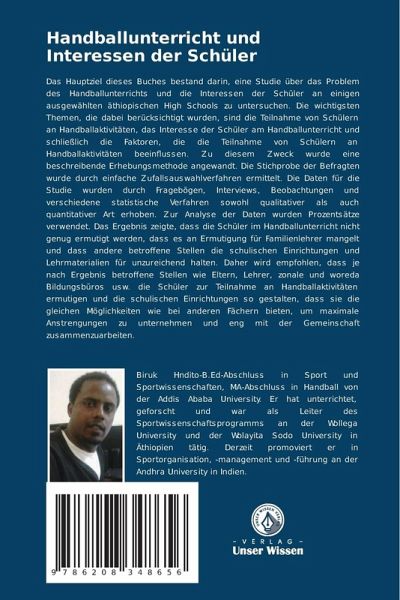 Das Hauptziel dieses Buches bestand darin, eine Studie über das Problem des Handballunterrichts und die Interessen der Schüler an einigen ausgewählten äthiopischen High Schools zu untersuchen. Die wichtigsten Themen, die dabei berücksichtigt wurden, sind die Teilnahme von Schülern an Handballaktivitäten, das Interesse der Schüler am Handballunterricht und schließlich die Faktoren, die die Teilnahme von Schülern an Handballaktivitäten beeinflussen. Zu diesem Zweck wurde eine beschreibende Erhebungsmethode angewandt. Die Stichprobe der Befragten wurde durch einfache Zufallsauswahlverfahren ermittelt. Die Daten für die Studie wurden durch Fragebögen, Interviews, Beobachtungen und verschiedene statistische Verfahren sowohl qualitativer als auch quantitativer Art erhoben. Zur Analyse der Daten wurden Prozentsätze verwendet. Das Ergebnis zeigte, dass die Schüler im Handballunterricht nicht genug ermutigt werden, dass es an Ermutigung für Familienlehrer mangelt und dass andere betroffene Stellen die schulischen Einrichtungen und Lehrmaterialien für unzureichend halten. Daher wird empfohlen, dass je nach Ergebnis betroffene Stellen wie Eltern, Lehrer, zonale und woreda Bildungsbüros usw. die Schüler zur Teilnahme an Handballaktivitäten ermutigen und die schulischen Einrichtungen so gestalten, dass sie die gleichen Möglichkeiten wie bei anderen Fächern bieten, um maximale Anstrengungen zu unternehmen und eng mit der Gemeinschaft zusammenzuarbeiten.