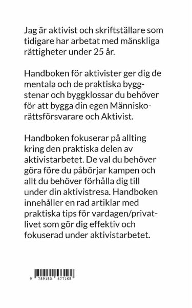 Handboken för aktivister ger dig de mentala och de praktiska byggstenar och byggklossar du behöver för att bygga din egen Människorättsförsvarare och Aktivist. Handboken fokuserar på allting kring den praktiska delen av aktivistarbetet. De val du behöver göra före du påbörjar kampen och allt du behöver förhålla dig till under din aktivistresa. Handboken innehåller en rad artiklar med praktiska tips för vardagen/privatlivet som gör dig effektiv och fokuserad under aktivistarbetet.