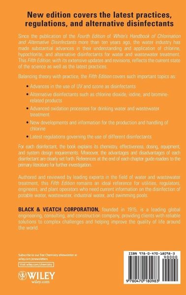 New edition covers the latest practices, regulations, and alternative disinfectants Since the publication of the Fourth Edition of White's Handbook of Chlorination and Alternative Disinfectants more than ten years ago, the water industry has made substantial advances in their understanding and application of chlorine, hypochlorite, and alternative disinfectants for water and wastewater treatment. This Fifth Edition, with its extensive updates and revisions, reflects the current state of the science as well as the latest practices. Balancing theory with practice, the Fifth Edition covers such important topics as: * Advances in the use of UV and ozone as disinfectants * Alternative disinfectants such as chlorine dioxide, iodine, and bromine-related products * Advanced oxidation processes for drinking water and wastewater treatment * New developments and information for the production and handling of chlorine * Latest regulations governing the use of different disinfectants For each disinfectant, the book explains its chemistry, effectiveness, dosing, equipment, and system design requirements. Moreover, the advantages and disadvantages of each disinfectant are clearly set forth. References at the end of each chapter guide readers to the primary literature for further investigation. Authored and reviewed by leading experts in the field of water and wastewater treatment, this Fifth Edition remains an ideal reference for utilities, regulators, engineers, and plant operators who need current information on the disinfection of potable water, wastewater, industrial water, and swimming pools.