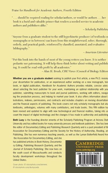 Whether you are a graduate student seeking to publish your first article, a new Ph.D. revising your dissertation for publication, or an experienced author working on a new monograph, textbook, or digital publication, Handbook for Academic Authors provides reliable, concise advice about selecting the best publisher for your work, maintaining an optimal relationship with your publisher, submitting manuscripts to book and journal publishers, working with editors, navigating the production process, and helping to market your book. It also offers information about illustrations, indexes, permissions, and contracts and includes a chapter on revising dissertations and one on the financial aspects of publishing. The book covers not only scholarly monographs but also textbooks, anthologies, multiauthor books, and trade books. This fifth edition has been revised and updated to align with new technological and financial realities, taking into account the impact of digital technology and the changes it has made in authorship and publishing.