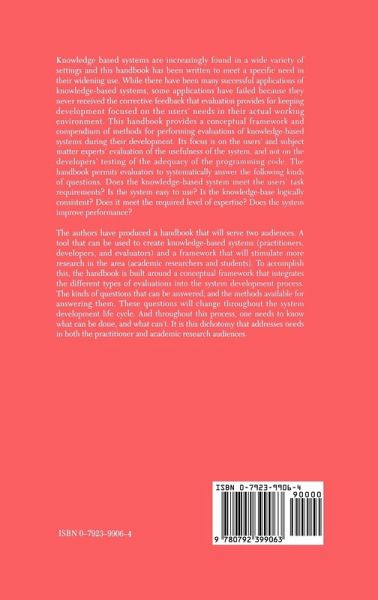 The authors have produced a handbook that will serve two audiences: a tool that can be used to create knowledge-based systems (practitioners, developers, and evaluators) and a framework that will stimulate more research in the area (academic researchers and students). To accomplish this, the handbook is built around a conceptual framework that integrates the different types of evaluations into the system of development process. The kinds of questions that can be answered, and the methods available for answering them, will change throughout the system development life cycle. And throughout this process, one needs to know what can be done, and what can't. It is this dichotomy that addresses needs in both the practitioner and academic research audiences.