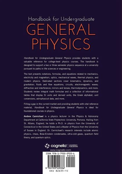 Handbook for Undergraduate General Physics provides students with a valuable reference for college-level physics courses. The handbook is designed to support a two or three semester physics sequence at a university pursuant to paths in life sciences or engineering. The text presents notations, formulas, and equations related to mechanics, electricity and magnetism, optics, mechanical waves, thermal physics, and modern physics. Dedicated sections cover kinematics, dynamics, and gravitation; fluids and flow equations; circuits; electromagnetic waves; diffraction and interference; mirrors and lenses; thermodynamics; and more. Students review integral math formulae and a collection of informational tables that display SI units and derived units, the Greek alphabet, unit conversions, astrophysical data, and more. Filling a gap in the current market and providing students with vital reference material, Handbook for Undergraduate General Physics is ideal for foundational courses in physics.
