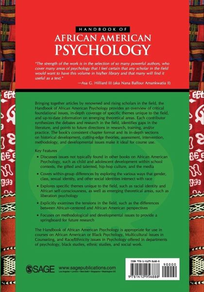 The Handbook of African American Psychology provides a comprehensive guide to current developments in African American psychology. It presents theoretical, empirical, and practical issues that are foundational to African American psychology. It synthesizes the debates in the field and research designed to understand the psychological, cognitive, and behavioral development of African Americans. The breadth and depth of the coverage in this handbook offers both foundational material and current developments. Although similar topics will be covered in this text that are included in other works, this will be the only work in which experts in the field write on contemporary debates related to these topics. Moreover, the proposed text incorporates other issues that are typically not covered in related books. The contributing authors also identify gaps in the literature and point to future directions in research, training, and practice.Key Features Contains the writings of renowned editors and contributors The most well-respected and accomplished editors and authors in the area of African American psychology, and psychology in general, have come together to lend their expert analysis of issues and research in this field.Designedfor course use With a consistent format from chapter to chapter and sections on historical development, cutting-edge theories, assessment, intervention, methodology, and development issues, instructors will find this handbook appropriate for use with upper-level undergraduate and graduate-level classesOffers unique coverage: The authors discuss issues not typically found in other books on African American psychology, such as ethics, certification, the gifted and talented, Hip-Hop and youth culture, common misconceptions about African Americans, and within-group differences related to gender, class, age, and sexual orientation."