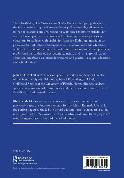 The Handbook of Arts Education and Special Education brings together, for the first time in a single reference volume, policy, research, and practices in special education and arts education synthesized to inform stakeholders across a broad spectrum of education. This handbook encompasses arts education for students with disabilities, from pre-K through transition to postsecondary education and careers as well as community arts education, with particular attention to conceptual foundations; research-based practices; professional standards; students' cognitive, artistic, and social growth; career education; and future directions for research and practice in special education and arts education.