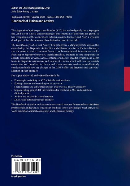 Key topics addressed in the Handbook include: Phenotypic variability in ASD: clinical considerations.Etiologic factors and transdiagnostic processes.Social worries and difficulties: autism and/or social anxiety disorder?Implementing group CBT interventions for youth with ASD and anxiety in clinical practice.Autism and anxiety in school settings.DSM-5 and autism spectrum disorder. The Handbook of Autism and Anxiety is an essential resource for researchers, clinicians/professionals and graduate students in child and school psychology, psychiatry, social work, education, clinical counseling and behavioral therapy.