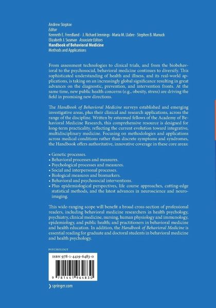 Health Behaviors: Processes and Measures.- Social and Environmental Determinants of Health Behaviors.- Cognitive Determinants of Health Behavior.- Assessment of Physical Activity in Research and Clinical Practice.- Dietary Assessment in Behavioral Medicine.- Assessment of Sexual Behavior.- By Force of Habit.- Adherence to Medical Advice: Processes and Measurement.- Psychological Processes and Measures.- Ecological Validity for Patient Reported Outcomes.- Item Response Theory and Its Application to Measurement in Behavioral Medicine.- Applications of Neurocognitive Assessment in Behavioral Medicine.- Lay Representations of Illness and Treatment: A Framework for Action.- Conceptualization, Measurement, and Analysis of Negative Affective Risk Factors.- Hostility and Health.- Positive Well-Being and Health.- Coping and Health.- Social and Interpersonal Processes.- Experimental Approaches to Social Interaction for the Behavioral Medicine Toolbox.- Social Support and Physical Health: Links and Mechanisms.- Social Networks and Health.- Social Norms and Health Behavior.- Social Marketing: A Tale of Beer, Marriage, and Public Health.- Epidemiological and Population Perspectives.- Assessment of Psychosocial Factors in Population Studies.- Socio-economic Position and Health.- Race, Ethnicity, and Health in a Global Context.- Neighborhood Factors in Health.- Health Literacy: A Brief Introduction.- Screening and Early Detection of Cancer: A Population Perspective.- The Impact of Behavioral Interventions in Public Health.- Genetic Process in Behavioral Medicine.- Quantitative Genetics in Behavioral Medicine.- Candidate Gene and Genome-Wide Association Studies in Behavioral Medicine.- Functional Genomic Approaches in Behavioral Medicine Research.- Genetics of Stress: Gene-StressCorrelation and Interaction.- Nicotine Dependence and Pharmacogenetics.- Genetics of Obesity and Diabetes.- Development and the Life Course.- A Life Course Approach to Health Behaviors: Theory and Methods.- Prenatal Origins of Development Health.- The Impact of Early Adversity on Health.- Health Disparities in Adolescence.- Reproductive Hormones and Stages of Life in Women: Moderators of Mood and Cardiovascular Health.- Aging and Behavioral Medicine.- Biological Measures and Biomarkers.- Use of Biological Measures in Behavioral Medicine.- Laboratory Stress Testing Methodology.- Stress and Allostasis.- Neuroendocrine Measures in Behavioral Medicine.- Immune Measures in Behavioral Medicine Research: Procedures and Implications.- Circulating Biomarkers of Inflammation, Adhesion, and Hemostasis in Behavioral Medicine.- The Metabolic Syndrome, Obesity, and Insulin Resistance.- The Non-invasive Assessment of Autonomic Influences on the Heart Using Impedance Cardiography and Heart Rate Variability.- Cardiac Measures.- Behavioral Medicine and Sleep: Concepts, Measures, and Methods.- Brain Function and Neuroimaging.- Neuroimaging Methods in Behavioral Medicine.- Applications of Neuroimaging in Behavioral Medicine.- Neuroimaging of Depression and Other Emotional States.- The Electric Brain and Behavioral Medicine.- Statistical Methods.- Reporting Results in Behavioral Medicine.- Moderators and Mediators: The MacArthur Updated View.- Multilevel Modeling.- Structural Equation Modeling in Behavioral Medicine Research.- Meta-analysis.- Behavioral and Psychosocial Interventions.- Trial Design in Behavioral Medicine.- Methodological Issues in Randomized Controlled Trials for the Treatment of Psychiatric Comorbidity in Medical Illness.- Quality of Life in Light of Appraisal and Response Shift.- Behavioral Interventions for Prevention and Management of Chronic Disease.- Psychosocial-Behavioral Interventions and Chronic Disease.- The Role of Interactive Communication Technologies in Behavioral Medicine.- Behavioral Medicine, Prevention, and Health Reform: Linking Evidence-Based Clinical and Public Health Strategies for Population Health Behavior Change.