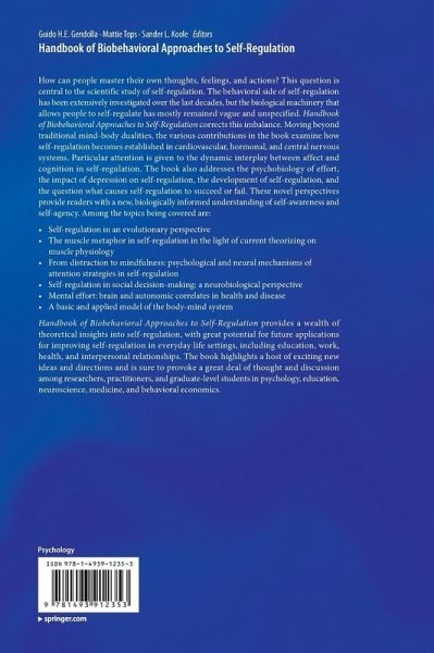 Handbook of Biobehavioral Approaches to Self-Regulation provides a wealth of theoretical insights into self-regulation, with great potential for future applications for improving self-regulation in everyday life settings, including education, work, health, and interpersonal relationships. The book highlights a host of exciting new ideas and directions and is sure to provoke a greatdeal of thought and discussion among researchers, practitioners, and graduate-level students in psychology, education, neuroscience, medicine, and behavioral economics.