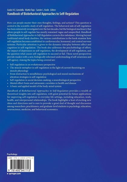 Handbook of Biobehavioral Approaches to Self-Regulation provides a wealth of theoretical insights into self-regulation, with great potential for future applications for improving self-regulation in everyday life settings, including education, work, health, and interpersonal relationships. The book highlights a host of exciting new ideas and directions and is sure to provoke a greatdeal of thought and discussion among researchers, practitioners, and graduate-level students in psychology, education, neuroscience, medicine, and behavioral economics.