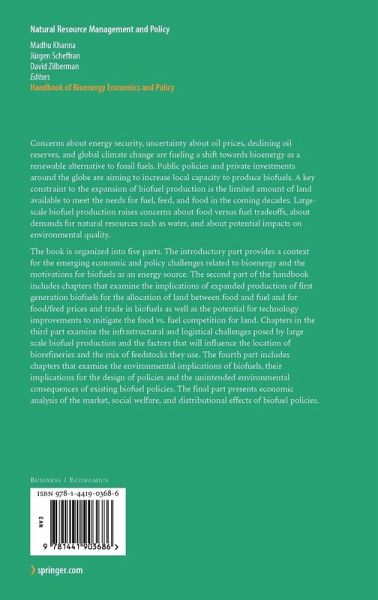 The book is organized into five parts. The introductory part provides a context for the emerging economic and policy challenges related to bioenergy and the motivations for biofuels as an energy source. The second part of the handbook includes chapters that examine the implications of expanded production of first generationbiofuels for the allocation of land between food and fuel and for food/feed prices and trade in biofuels as well as the potential for technology improvements to mitigate the food vs. fuel competition for land. Chapters in the third part examine the infrastructural and logistical challenges posed by large scale biofuel production and the factors that will influence the location of biorefineries and the mix of feedstocks they use. The fourth part includes chapters that examine the environmental implications of biofuels, their implications for the design of policies and the unintended environmental consequences of existing biofuel policies. The final part presents economic analysis of the market, social welfare, and distributional effects of biofuel policies.
