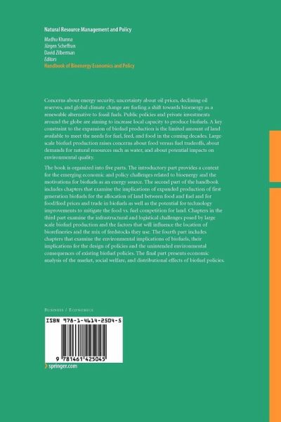 The book is organized into five parts. The introductory part provides a context for the emerging economic and policy challenges related to bioenergy and the motivations for biofuels as an energy source. The second part of the handbook includes chapters that examine the implications of expanded production of first generationbiofuels for the allocation of land between food and fuel and for food/feed prices and trade in biofuels as well as the potential for technology improvements to mitigate the food vs. fuel competition for land. Chapters in the third part examine the infrastructural and logistical challenges posed by large scale biofuel production and the factors that will influence the location of biorefineries and the mix of feedstocks they use. The fourth part includes chapters that examine the environmental implications of biofuels, their implications for the design of policies and the unintended environmental consequences of existing biofuel policies. The final part presents economic analysis of the market, social welfare, and distributional effects of biofuel policies.