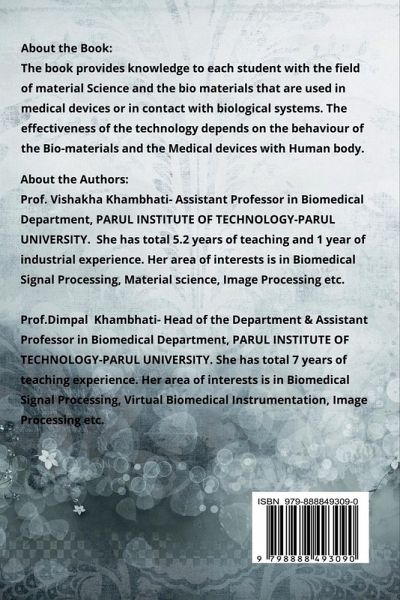 The book provides knowledge to each student with the field of material Science and the bio materials that are used in medical devices or in contact with biological systems. The effectiveness of the technology depends on the behaviour of the Bio-materials and the Medical devices with Human body.