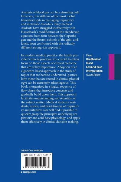Handbook of Blood Gas/Acid-Base Interpretation, 2nd edition, simplifies concepts in blood gas/acid base interpretation and explains in an algorithmic fashion the physiological processes for managing respiratory and metabolic disorders. With this handbook, medical students, residents, nurses, and practitioners of respiratory and intensive care will find it possible to quickly grasp the principles underlying respiratory and acid-base physiology, and apply them. Uniquely set out in the form of flow-diagrams/algorithms charts, this handbook introduces concepts in a logically organized sequence and gradually builds upon them. The treatment of the subject in this format, describing processes in logical steps makes it easy for the reader to cover a difficult- and sometimes dreaded- subject rapidly.