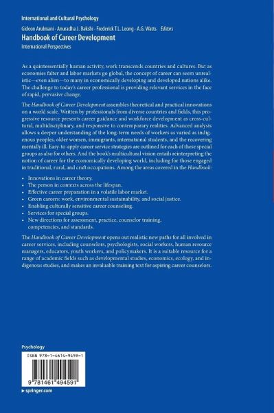 "Handbook of career development: International perspectives comprises 41 chapters across a multitude of key themes including theoretical perspectives, assessment and evaluation, special populations, and counsellor competencies. The international team of contributors often share specific examples from their respective countries, bringing an important global perspective to topics of interest and concern.... Whether your primary interest is in theory, assessment, evaluation,or training, the Handbook of career development: International perspectives is a "must have" for anyone involved in career practice." (Deirdre Pickerell, CCPA Career Counsellors Chapter, ccpacdchapter.blogspot.de, March, 2014)