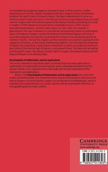 This third volume turns to topos theory and the idea of sheaves. The theory of locales is considered first, and Grothendieck toposes are introduced. Notions of sketchability and accessible categories are discussed, and an axiomatic generalization of the category of sheaves is given.