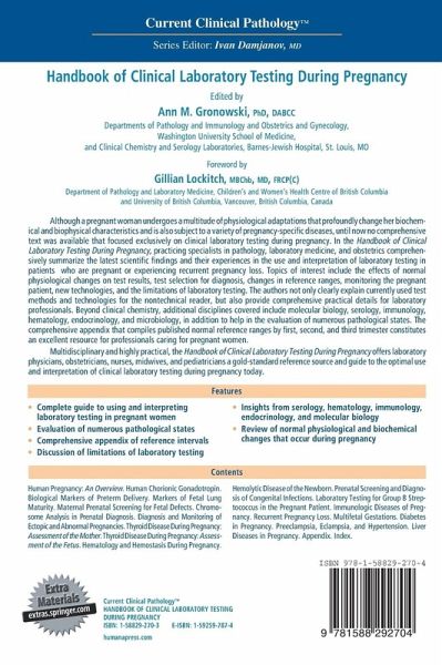 Practicing specialists in pathology, laboratory medicine, and obstetrics comprehensively summarize the latest scientific findings and their experiences in the use and interpretation of laboratory testing in patients who are pregnant or experiencing recurrent pregnancy loss. Topics of interest include the effects of normal physiological changes on test results, test selection for diagnosis, changes in reference ranges, monitoring the pregnant patient, new technologies, and the limitations of laboratory testing. The authors not only clearly explain currently used test methods and technologies for the nontechnical reader, but also provide comprehensive details for laboratory professionals. The comprehensive appendix that compiles published normal reference ranges by first, second, and third trimester consttitutes an excellent resource for professionals caring for pregnant women. Although a pregnant woman undergoes a multitude of physiological adaptations that profoundly change her biochemical and biophysical characteristics and is also subject to a variety of pregnancy-specific diseases, until now no comprehensive text was available that focused exclusively on clinical laboratory testing during pregnancy. In the Handbook of Clinical Laboratory Testing During Pregnancy, practicing specialists in pathology, laboratory medicine, and obstetrics comprehensively summarize the latest scientific findings and their experiences in the use and interpretation of laboratory testing in patients who are pregnant or experiencing recurrent pregnancy loss. Topics of interest include the effects of normal physiological changes on test results, test selection for diagnosis, changes in reference ranges, monitoring the pregnant patient, new technologies, and the limitations of laboratory testing. The authors not only clearly explain currently used test methods and technologies for the nontechnical reader, but also provide comprehensive practical details for laboratory professionals. Beyond clinical chemistry, additional disciplines covered include molecular biology, serology, immunology, hematology, endocrinology, and microbiology, in addition to help in the evaluation of numerous pathological states. The comprehensive appendix that compiles published normal reference ranges by first, second, and third trimester constitutes an excellent resource for professionals caring for pregnant women.