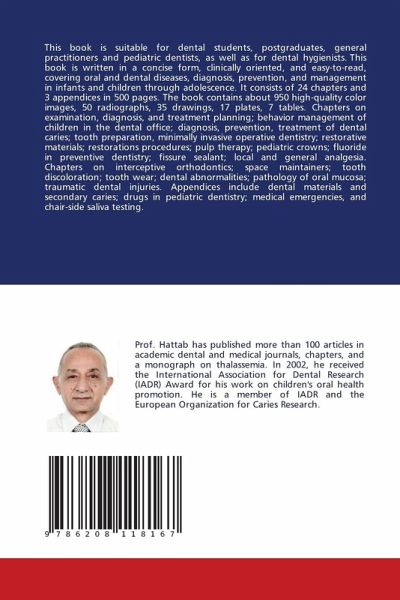 This book is suitable for dental students, postgraduates, general practitioners and pediatric dentists, as well as for dental hygienists. This book is written in a concise form, clinically oriented, and easy-to-read, covering oral and dental diseases, diagnosis, prevention, and management in infants and children through adolescence. It consists of 24 chapters and 3 appendices in 500 pages. The book contains about 950 high-quality color images, 50 radiographs, 35 drawings, 17 plates, 7 tables. Chapters on examination, diagnosis, and treatment planning; behavior management of children in the dental office; diagnosis, prevention, treatment of dental caries; tooth preparation, minimally invasive operative dentistry; restorative materials; restorations procedures; pulp therapy; pediatric crowns; fluoride in preventive dentistry; fissure sealant; local and general analgesia. Chapters on interceptive orthodontics; space maintainers; tooth discoloration; tooth wear; dental abnormalities;pathology of oral mucosa; traumatic dental injuries. Appendices include dental materials and secondary caries; drugs in pediatric dentistry; medical emergencies, and chair-side saliva testing.