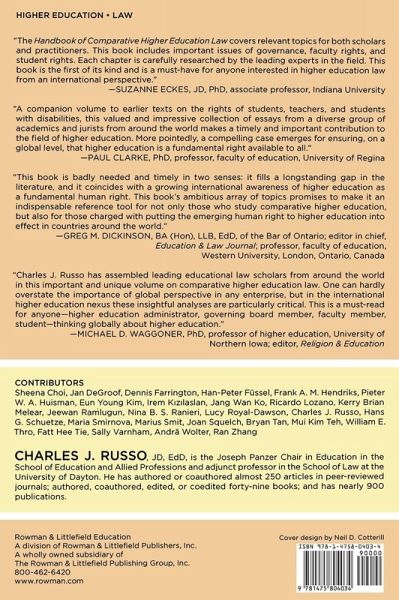 Preface 1. International Documents and Higher Education- Kerry Brian Melear 2.Australia- Joan Squelch 3.Brazil- Nina Ranieri 4.Canada- Hans G. Schuetze 5.China Ran Zhang 6.Europe- Jan DeGroof 7. Germany- Hans-Peter Fussel & Andrä Wolter 8. Great Britain Dennis Farrington 9.Korea- Jang Wan Ko, Sheena Choi, & Eun Young Kim 10.Malaysia- Tie Fatt Hee 11.Mauritius- Jeewan Ramlugun 12.Netherlands- Pieter Huisman & Frank A.M. Hendriks 13.New Zealand- Sally Varnham 14.Russia- Maria Smirnov 15.Singapore- Mui Kim The & Bryan tan 16. South Africa- Marius Smit 17.Turkey- Ricardo Lozano & Irem Kizilaslan 18.United States William E. Thro 19. Higher Education as a Human Right- Lucy Royal-Dawson 20. Analysis- Charles J. Russo