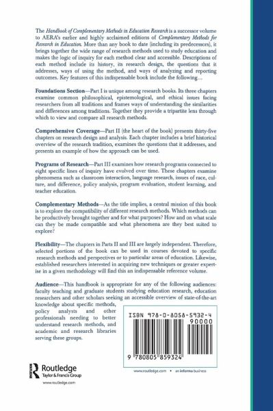 Published for the American Educational Research Association by Routledge. The Handbook of Complementary Methods in Education Research is a successor volume to AERA's earlier and highly acclaimed editions of Complementary Methods for Research in Education. More than any book to date (including its predecessors), this new volume brings together the wide range of research methods used to study education and makes the logic of inquiry for each method clear and accessible. Each method is described in detail, including its history, its research design, the questions that it addresses, ways of using the method, and ways of analyzing and reporting outcomes. Key features of this indispensable book include the following: Foundations Section-Part I is unique among research books. Its three chapters examine common philosophical, epistemological, and ethical issues facing researchers from all traditions, and frames ways of understanding the similarities and differences among traditions. Together they provide a tripartite lens through which to view and compare all research methods. Comprehensive Coverage-Part II (the heart of the book) presents 35 chapters on research design and analysis. Each chapter includes a brief historical overview of the research tradition, examines the questions that it addresses, and presents an example of how the approach can be used. Programs of Research-Part III examines how research programs connected to eight specific lines of inquiry have evolved over time. These chapters examine phenomena such as classroom interaction; language research; issues of race, culture, and difference; policy analysis; program evaluation; student learning; and teacher education. Complementary Methods-As the title suggests, a central mission of this book is to explore the compatibility of different research methods. Which methods can be productively brought together and for what purposes? How and on what scale can they be made compatible and what phenomena are they best suited to explore? Flexibility-The chapters in Parts II and III are largely independent. Therefore, selected portions of the book can be used in courses devoted to specific research methods and perspectives or to particular areas of education. Likewise, established researchers interested in acquiring new techniques or greater expertise in a given methodology will find this an indispensable reference volume. This handbook is appropriate for any of the following audiences: faculty teaching and graduate students studying education research, education researchers and other scholars seeking an accessible overview of state-of-the-art knowledge about specific methods, policy analysts and other professionals needing to better understand research methods, and academic and research libraries serving these audiences.