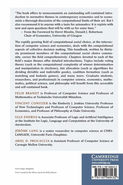 Foreword Hervé Moulin; 1. Introduction to computational social choice Felix Brandt, Vincent Conitzer, Ulle Endriss, Jérôme Lang and Ariel D. Procaccia; Part I. Voting: 2. Introduction to the theory of voting William S. Zwicker; 3. Tournament solutions Felix Brandt, Markus Brill and Paul Harrenstein; 4. Weighted tournament solutions Felix Fischer, Olivier Hudry and Rolf Niedermeier; 5. Dodgson's rule and Young's rule Ioannis Caragiannis, Edith Hemaspaandra and Lane A. Hemaspaandra; 6. Barriers to manipulation in voting Vincent Conitzer and Toby Walsh; 7. Control and bribery in voting Piotr Faliszewski and Jörg Rothe; 8. Rationalizations of voting rules Edith Elkind and Arkadii Slinko; 9. Voting in combinatorial domains Jérôme Lang and Lirong Xia; 10. Incomplete information and communication in voting Craig Boutilier and Jeffrey S. Rosenschein; Part II. Fair Allocation: 11. Introduction to the theory of fair allocation William Thomson; 12. Fair allocation of indivisible goods Sylvain Bouveret, Yann Chevaleyre and Nicolas Maudet; 13. Cake cutting algorithms Ariel D. Procaccia; Part III. Coalition Formation: 14. Matching under preferences Bettina Klaus, David F. Manlove and Francesca Rossi; 15. Hedonic games Haris Aziz and Rahul Savani; 16. Weighted voting games Georgios Chalkiadakis and Michael Wooldridge; Part IV. Additional Topics: 17. Judgment aggregation Ulle Endriss; 18. The axiomatic approach and the internet Moshe Tennenholtz and Aviv Zohar; 19. Knockout tournaments Virginia Vassilevska-Williams.