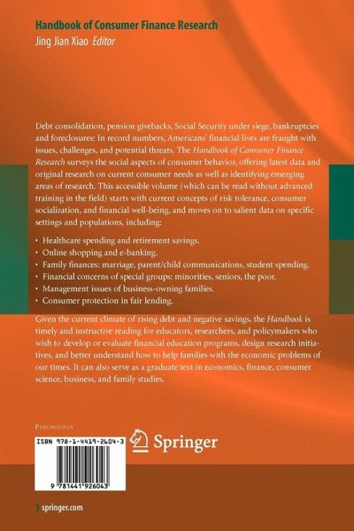 Debt consolidation; pension givebacks; Social Security under siege; bankruptcies and foreclosures; Americans' financial lives are fraught with issues, challenges, and potential threats, in record numbers. The Handbook of Consumer Finance Research surveys the social aspects of consumer behavior, offering latest data and original research on current consumer needs as well as identifying emerging areas of research. This accessible volume (which can be read without advanced training in the field) starts with current concepts of risk tolerance, consumer socialization, and financial well-being, and moves on to salient data on specific settings and populations, including: Healthcare spending and retirement savings; Online shopping and e-banking; Family finances: marriage, parent/child communications, student spending; Financial concerns of special groups: minorities, seniors, the poor; Management issues of business-owning families; Consumer protection in fair lending.