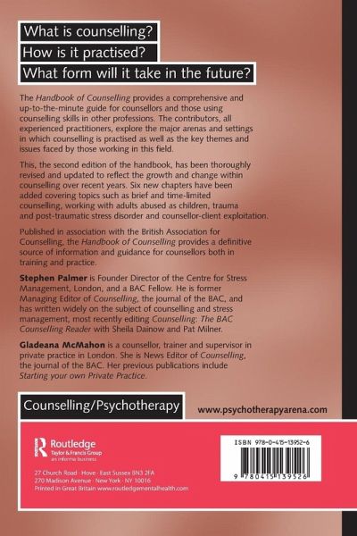 The Handbook of Counselling provides a comprehensive and up-to-the-minute guide for counsellors and those using counselling skills in other professions. The contributors, all experienced practitioners, explore the major arenas and settings in which counselling is practised as well as the key themes and issues faced by those working in this field. This edition of the handbook has been thoroughly revised and updated to reflect the pace of growth and change within counselling over recent years. Six new chapters have been added, covering: * brief and time-limited counselling * working with adults abused as children * trauma and post-traumatic stress disorder * counsellor-client exploitation * private practice * counselling in voluntary settings. Published in association with the British Association for Counselling, the Handbook of Counselling provides a definitive source of information and guidance for counsellors both in training and practice.