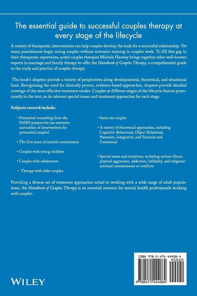 The essential guide to successful couples therapy at every stage of the lifecycle A variety of therapeutic interventions can help couples develop the tools for a successful relationship. Yet many practitioners begin seeing couples without extensive training in couples work. To fill this gap in their therapeutic repertoires, noted couples therapist Michele Harway brings together other well-known experts in marriage and family therapy to offer the Handbook of Couples Therapy, a comprehensive guide to the study and practice of couples therapy. The book's chapters provide a variety of perspectives along developmental, theoretical, and situational lines. Recognizing the need for clinically proven, evidence-based approaches, chapters provide detailed coverage of the most effective treatment modes. Couples at different stages of the lifecycle feature prominently in the text, as do relevant special issues and treatment approaches for each stage. Subjects covered include: * Premarital counseling from the PAIRS perspective (an extensive curriculum of interventions for premarital couples) * The first years of marital commitment * Couples with young children * Couples with adolescents * Therapy with older couples * Same sex couples * A variety of theoretical approaches, including Cognitive-Behavioral, Object Relational, Narrative, Integrative, and Feminist and Contextual * Special issues and situations, including serious illness, physical aggression, addiction, infidelity, and religious/spiritual commitments or conflicts Providing a diverse set of treatment approaches suited to working with a wide range of adult populations, the Handbook of Couples Therapy is an essential resource for mental health professionals working with couples.