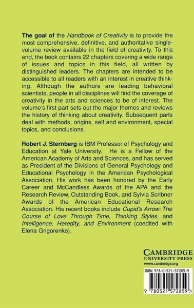 The goal of the Handbook of Creativity is to provide the most comprehensive, definitive, and authoritative single-volume review available in the field of creativity. To this end, the book contains 22 chapters covering a wide range of issues and topics in the field of creativity, all written by distinguished leaders in the field. The chapters have been written to be accessible to all educated readers with an interest in creative thinking. Although the authors are leading behavioral scientists, people in all disciplines will find the coverage of creativity divided in the arts and sciences to be of interest. The volume is divided into six parts. Part I, the Introduction, sets out the major themes and reviews the history of thinking about creativity. Subsequent parts deal with methods, origins, self and environment, special topics and conclusions.