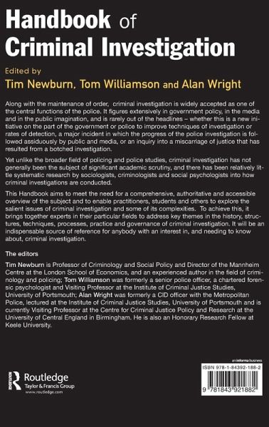 1. Understanding Investigation Part 1: Criminal Investigation in Context 2. History of Criminal Investigation 3. Social context of Criminal Investigation 4. Psychology and Criminal Investigation 5. Law and Criminal Investigation 6 Criminal Investigation and the Media Part 2: Organization of Criminal Investigation 7. International Structures and Transnational Crime 8. Criminal Intelligence and the National Intelligence Model 9. The Investigation of High-volume Crime 10. Investigation and Major Crime Inquiries 11. Private Investigation Part 3: Forensic Techniques 12. Principles of Forensic Identification Science 13. Forensic Investigation in the UK 14. Trace Biometrics and Criminal Investigations 15. The Application of Forensic Science to Criminal Investigation Part 4: Investigative Sources and Processes 16. Models of Investigation 17. Covert Surveillance and Informer Handling 18. Victims and Witnesses in Criminal Investigation 19. Investigative Interviewing 20. Profiling Suspects 21. Profiling Places: Geodemographics and GIS Part 5: Governance of Criminal Investigation 22. The Management, Supervision and Oversight of Criminal Investigation 23. Critical Incidents: Investigation, Management and Training 24. Ethics and Corruption 25. Miscarriages of Justice 26. Professionalizing Criminal Investigation 27. The Future of Investigation