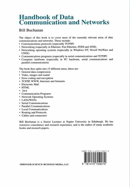 General data compression (Chapters 2 and 3)Video, images and sound (Chapters 4-11 )Error coding and encryption (Chapters 12-17)TCP/IP, WWW, Internets and Intranets (Chapters 18-20 and 23)Electronic Mail (Chapter 21 )HTML (Chapters 25 and 26)Java (Chapters 27-29)Communication Programs (Chapters 20, 29 and 49)Network Operating Systems (Chapters 31-34)LANs/WANs (Chapters 35, 38-46)Serial Communications (Chapters 47 and 48)Parallel Communications (Chapters 50-52)Local Communications (Chapters 53-57)Routing and Protocols (Chapters 36 and 37)Cables and connectors (Chapters 58--60)
