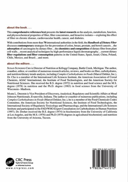 Dietary Fiber in Health and Disease 1. Dietary Fiber Overview 2. Dietary Fiber and Cardiovascular Disease 3. Dietary Fiber and Colon Cancer 4. Dietary Fiber and Breast Cancer Risk 5. Dietary Fiber and Breast Cancer Epidemiology 6. Dietary Fiber and Prostate Cancer 7. Dietary Fiber and Glucose Metabolism and Diabetes 8. Resistant Oligosaccharides 9. Resistant Starches, Fermentation, and Large Bowel Health 10. Resistant Starches and Lipid Metabolism 11. Critical Review of Hydrogen Breath Test Methods in Resistant Starch and Dietary Fiber Research 12. Lactulose: A Review on Effects, Clinical Results, and Safety Aspects in Relation to Its Influence on the Colonic Environment Physicochemical Properties 13. Physicochemical Properties of Dietary Fiber: Overview 14. Adsorption of Carcinogens by Dietary Fiber 15. Dietary Fiber and Mineral Interaction 16. The Influence of Wheat Fiber and Bran on Mineral Nutriture 17. Nondigestible Oligosaccharides and Mineral Absorption 18. Enzymatic Modification of Dietary Fiber Sources Chemistry and Analysis 19. Chemistry, Architecture, and Composition of Dietary Fiber from Plant Cell Walls 20. Chemistry and Analysis of Lignin 21. High-Performance Liquid Chromatography Techniques Used in Dietary Fiber and Complex Carbohydrates Analysis 22. Dietary Fiber-Associated Compounds: Chemistry, Analysis, and Nutritional Effects of Polyphenols Functional Dietary Fiber Ingredients 23. Food Uses of Fiber 24. Wheat Bran: Physiological Effects 25. Psyllium: Food Applications, Efficacy, and Safety 26. Oat Fiber: Production, Composition, Physicochemical Properties, Physiological Effects, Safety, and Food Applications 27. Barley Fiber 28. Rice Bran: Production, Composition, Availability, Healthful Properties, Safety, and Food Applications 29. Sugar Beet Fiber: Production, Composition, Physicochemical Properties, Physiological Effects, Safety, and Food Applications 30. Pectin: Composition, Chemistry, Physicochemical Properties, Food Applications, and Physiol