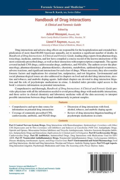 Comprehensive and easy-to-use, Handbook of Drug Interactions: A Clinical and Forensic Guide provides physicians with all the information needed to avoid prescribing drugs with undesirable interactions, and toxicologists with all the data necessary to interpret possible interactions between drugs found simultaneously in patient samples.