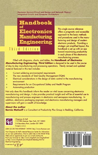 This single source reference offers a pragmatic and accessible approach to the basic methods and procedures used in the manufacturing and design of modern electronic products. Providing a stategic yet simplified layout, this handbook is set up with an eye toward maximizing productivity in each phase of the eletronics manufacturing process. Not only does this handbook inform the reader on vital issues concerning electronics manufacturing and design, it also provides practical insight and will be of essential use to manufacturing and process engineers in electronics and aerospace manufacturing. In addition, electronics packaging engineers and electronics manufacturing managers and supervisors will gain a wealth of knowledge.