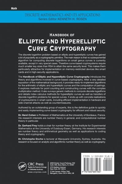 The broad coverage of all- important areas makes this book a complete handbook of elliptic and hyperelliptic curve cryptography and an invaluable reference to anyone interested in this exciting field.