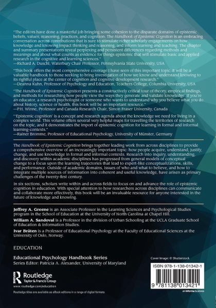 The Handbook of Epistemic Cognition brings together leading work from across disciplines, to provide a comprehensive overview of an increasingly important topic: how people acquire, understand, justify, change, and use knowledge in formal and informal contexts. Research into inquiry, understanding, and discovery within academic disciplines has progressed from general models of conceptual change to a focus upon the learning trajectories that lead to expert-like conceptualizations, skills, and performance. Outside of academic domains, issues of who and what to believe, and how to integrate multiple sources of information into coherent and useful knowledge, have arisen as primary challenges of the 21st century. In six sections, scholars write within and across fields to focus and advance the role of epistemic cognition in education. With special attention to how researchers across disciplines can communicate and collaborate more effectively, this book will be an invaluable resource for anyone interested in the future of knowledge and knowing. Dr. Jeffrey A. Greene is an associate professor of Learning Sciences and Psychological Studies in the School of Education at the University of North Carolina at Chapel Hill. Dr. William A. Sandoval is a professor in the division of Urban Schooling at the UCLA Graduate School of Education & Information Studies. Dr. Ivar Bråten is a professor of Educational Psychology at the Faculty of Educational Sciences at the University of Oslo, Norway.