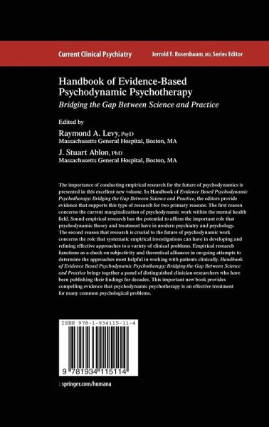 "Handbook of Evidence-Based Psychodynamic Psychotherapy: Bridging the Gap Between Science and Practice offers a coherent and user-friendly introduction to the field. ... Each chapter is self-contained ... . Chapters are written for clinicians: research methodology and statistical analyses are explained clearly, and chapters are relatively short, easy to read and emphasize research questions of interest to clinicians ... . thought-provoking, and it will make pleasurable reading for any psychoanalytic clinician interested in learning about current developments in psychotherapy research." (Eve Caligor, The International Journal of Psychoanalysis, Vol. 91, 2010)