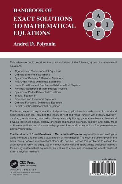 The Handbook of Exact Solutions to Mathematical Equations generally has no analogs in world literature and contains a vast amount of new material. The exact solutions given in the book, being rigorous mathematical standards, can be used as test problems to assess the accuracy and verify the adequacy of various numerical and approximate analytical methods for solving mathematical equations, as well as to check and compare the effectiveness of exact analytical methods.