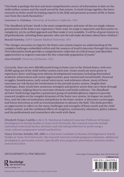 Currently, there are over 400,000 youth living in foster care in the United States, with over 20,000 aging out of the child welfare system each year. Foster youth are more prone to experience short- and long-term adverse developmental outcomes including diminished academic achievement and career opportunities, poor mental and overall health, financial struggles, homelessness, early sexual intercourse, and substance abuse, many of these outcomes are risk factors for involvement in the juvenile justice system. Despite their challenges, foster youth have numerous strengths and positive assets that carry them through their journeys, helping them to overcome obstacles and build resilience. The Handbook of Foster Youth brings together a prominent group of multidisciplinary experts to provide nuanced insights on the complex dynamics of the foster care system, its impact on youth's lives, and the roles of institutions and policies in the foster system. It discusses current gaps and future directions as well as recommendations to advance the field. This book provides an opportunity to reflect on the many challenges and strengths of foster youth and the child welfare system, and the combined efforts of caregivers, community volunteers, policy makers, and the professionals and researchers who work with them.