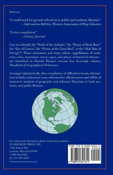 New in Paper! Can you identify the 'Bride of the Adriatic'?, the 'Home of Bock Beer'?, the 'Eye of Greece'?, the 'Home of the Great Bed'?, the 'Sick Man of Europe'? These nicknames and many others-appellations of countries, cities, mountains, rivers, capes and places of historical interest- are identified in Harold Sharp's concise but thorough volume. Arranged in one alphabetical listing, the book includes nicknames cross-referenced to the official name of each unit, shown as a main entry. Previously published in cloth [0-8108-1280-0]