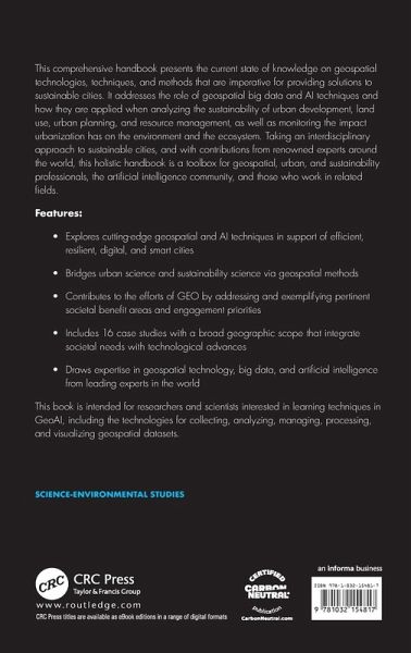 This comprehensive handbook presents the current state of knowledge on geospatial technologies, techniques, and methods that are imperative for providing solutions to sustainable cities. It addresses the role of geospatial big data and AI techniques and how they are applied when analyzing the sustainability of urban development.