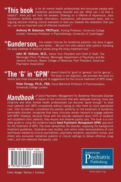 This book is a complete guide to using the evidence-based Good Psychiatric Management (GPM) approach for the treatment of BPD. The book demystifies the disorder, supplying treatment guidelines, case studies, and online video demonstrations of core techniques needed to deliver effective short-term, intermittent, and non-intensive therapeutic care.