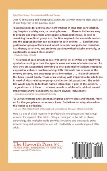 Here is a one-of-a-kind resource for professionals who prepare and lead group activities for impaired older adults. Filling a crucial gap in the field of clinical gerontology, this invaluable guide provides more than 70 stimulating and therapeutic group activities designed specifically for use with moderately to severely impaired older adults. Even though group activities designed for children, adolescents, and young adults are inadequate and inappropriate for use with older adults who have significant cognitive, emotional, and physical limitations or impairments, very little has been published--until now--on activities designed to meet the special needs of this population.Comprehensive and well-organized This comprehensive and well-organized resource does even more than provide over 70 activities at your fingertips. It also includes a recommended schedule of activities for a typical day, helpful suggestions for planning and leading group activities, and valuable tips for creating your own group activities that are effective, therapeutic, and entertaining. Each entry includes information on the activity's therapeutic value, the optimal group size, the time required, the materials needed, guidelines for adaptation, and blank space for your notes. Also for your convenience, symbols are used to indicate the therapeutic objective and the ease with which the activity can be implemented. Provides the foundation for a daily activities program Handbook of Group Activities for Impaired Older Adults provides the foundation for a therapeutic and enjoyable daily activities program that facilitates emotional expression, enhances problem solving skills and sensory stimulation, and encourages social interaction. Social workers, nurses, psychologists, psychiatrists, recreational therapists, group therapists, and related paraprofessionals who work in nursing or convalescent hospitals, adult day care or day treatment facilities, and retirement homes will not want to be without this practical guidebook.