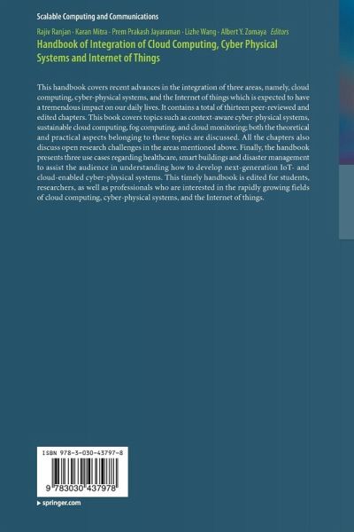 This handbook covers recent advances in the integration of three areas, namely, cloud computing, cyber-physical systems, and the Internet of things which is expected to have a tremendous impact on our daily lives. It contains a total of thirteen peer-reviewed and edited chapters. This book covers topics such as context-aware cyber-physical systems, sustainable cloud computing, fog computing, and cloud monitoring; both the theoretical and practical aspects belonging to these topics are discussed. All the chapters also discuss open research challenges in the areas mentioned above. Finally, the handbook presents three use cases regarding healthcare, smart buildings and disaster management to assist the audience in understanding how to develop next-generation IoT- and cloud-enabled cyber-physical systems. This timely handbook is edited for students, researchers, as well as professionals who are interested in the rapidly growing fields of cloud computing, cyber-physical systems, and the Internet of things.