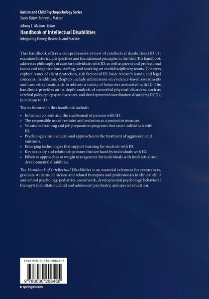 This handbook offers a comprehensive review of intellectual disabilities (ID). It examines historical perspectives and foundational principles in the field. The handbook addresses philosophy of care for individuals with ID, as well as parent and professional issues and organizations, staffing, and working on multidisciplinary teams. Chapters explore issues of client protection, risk factors of ID, basic research issues, and legal concerns. In addition, chapters include information on evidence-based assessments and innovative treatments to address a variety of behaviors associated with ID. The handbook provides an in-depth analysis of comorbid physical disorders, such as cerebral palsy, epilepsy and seizures, and developmental coordination disorders (DCD), in relation to ID. Topics featured in this handbook include:Informed consent and the enablement of persons with ID. The responsible use of restraint and seclusion as a protective measure. Vocational training and job preparation programs that assist individuals with ID. Psychological and educational approaches to the treatment of aggression and tantrums. Emerging technologies that support learning for students with ID. Key sexuality and relationship issues that are faced by individuals with ID.Effective approaches to weight management for individuals with intellectual and developmental disabilities. The Handbook of Intellectual Disabilities is an essential reference for researchers, graduate students, clinicians and related therapists and professionals in clinical child and school psychology, pediatrics, social work, developmental psychology, behavioral therapy/rehabilitation, child and adolescent psychiatry, and special education.